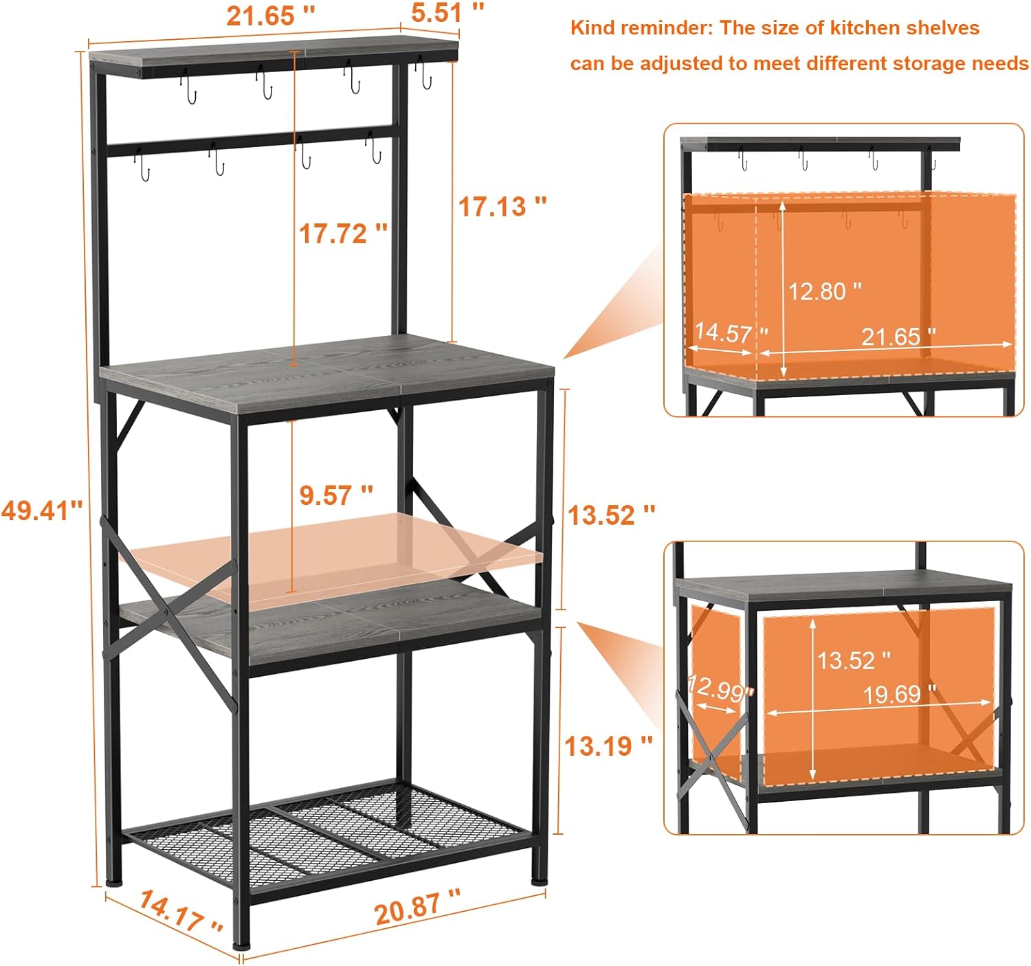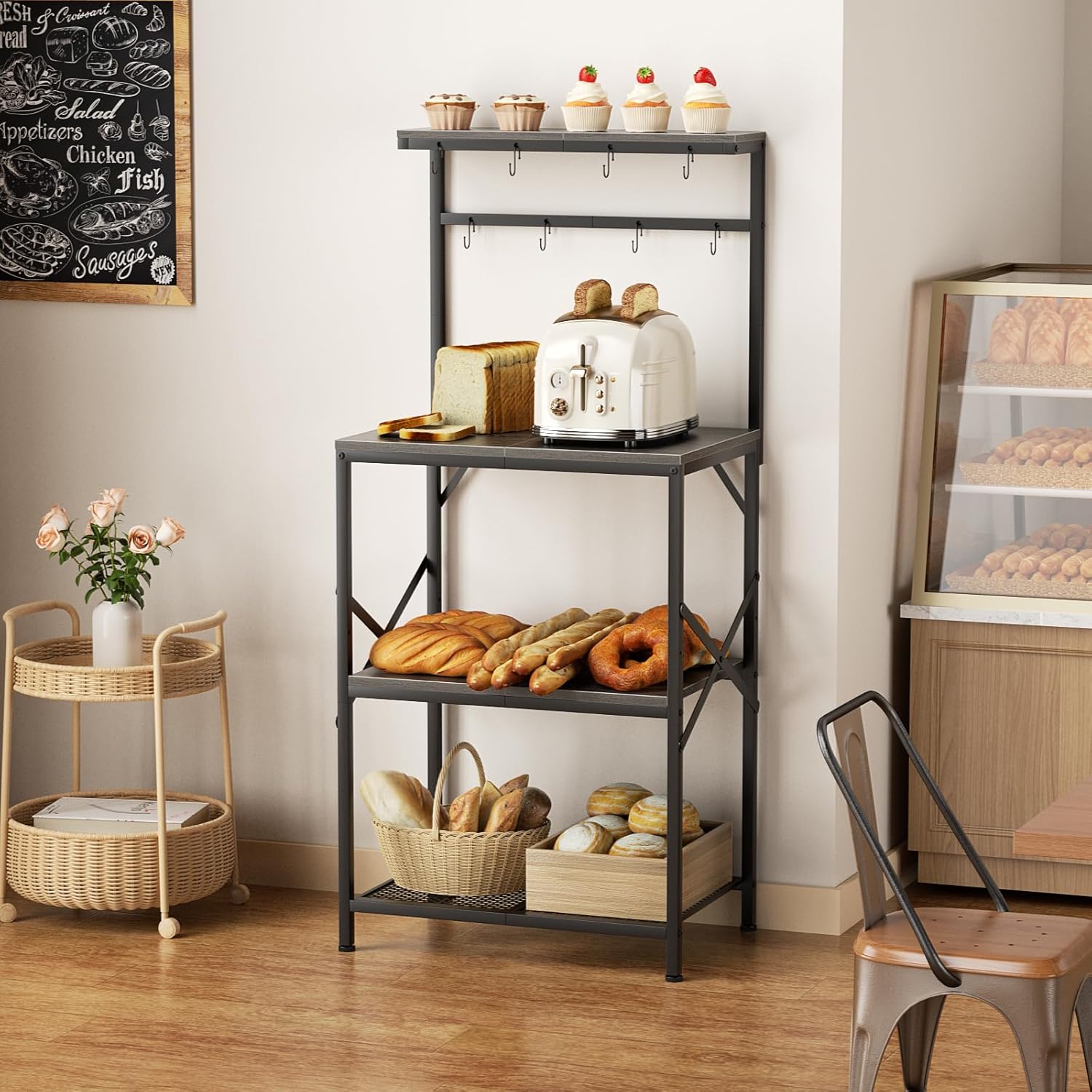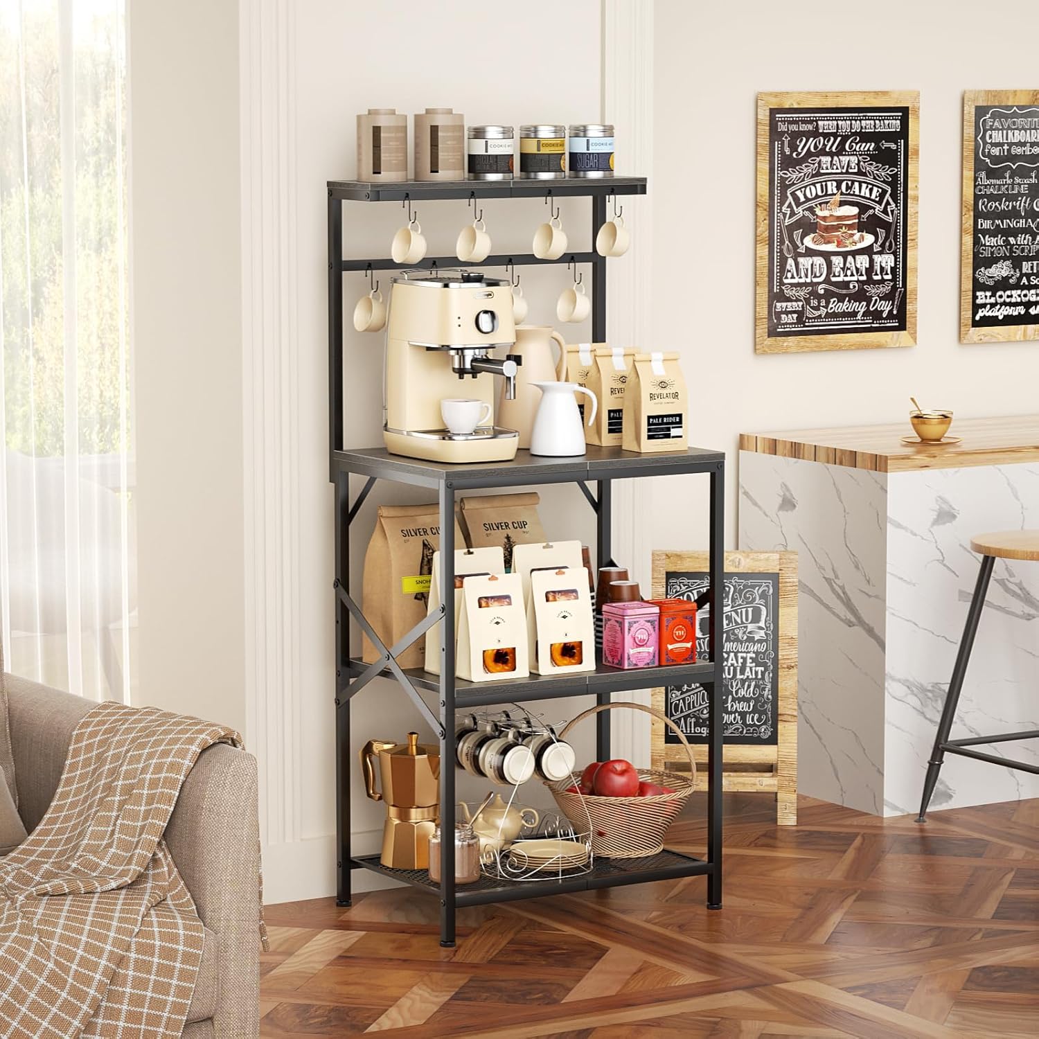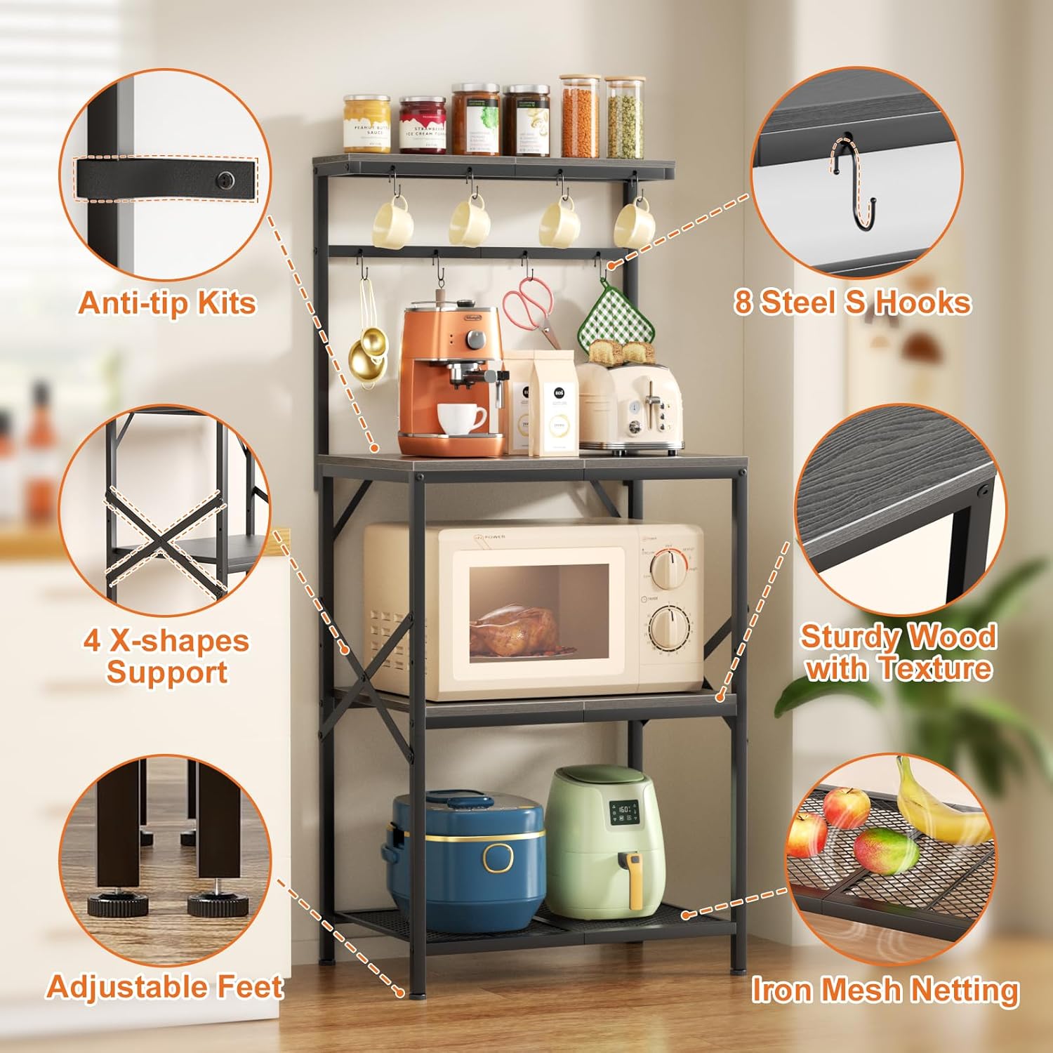 Kitchen Bakers Rack with Storage Shelves, Small Coffee Bar Cart with 8 Hooks, 4 Tiers Microwave Stand Station with Adjustable Shelves, Freestanding Kitchen Appliance Organizer, Black Oak