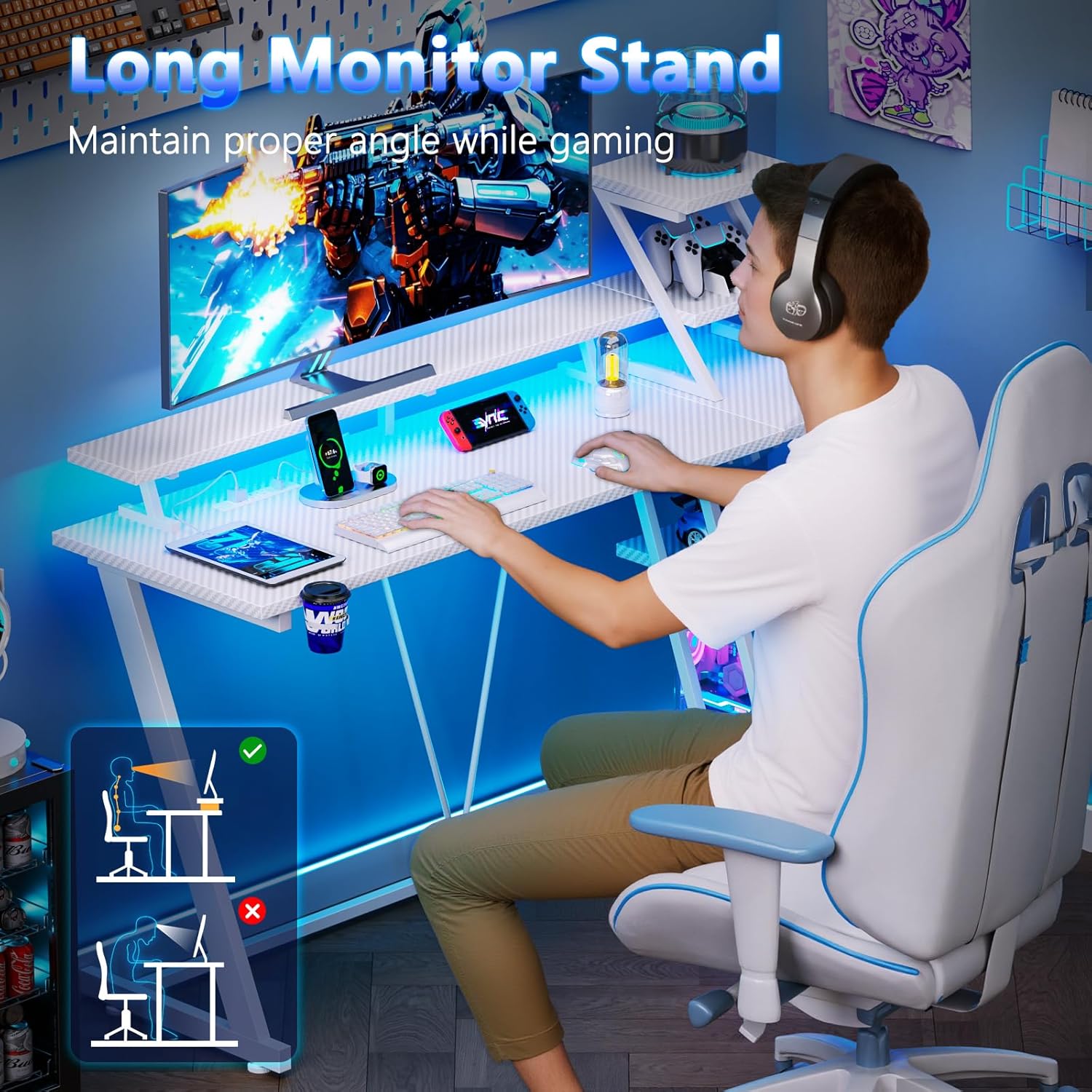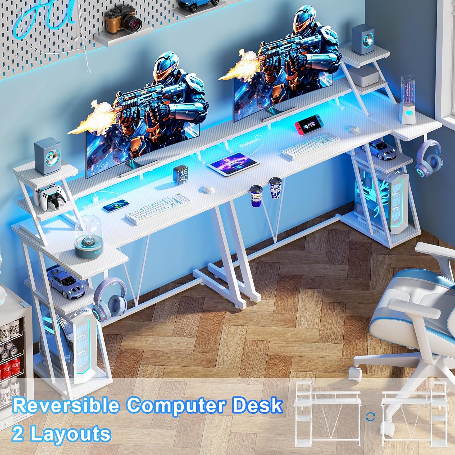 Extra User-friendly Design: The reversible gaming table comes with a cup holder and headphone holder that can be switched at will. The full desktop monitor stand can easily accommodate two computers and save desktop space. It also helps you maintain proper sitting posture and prevents slouching