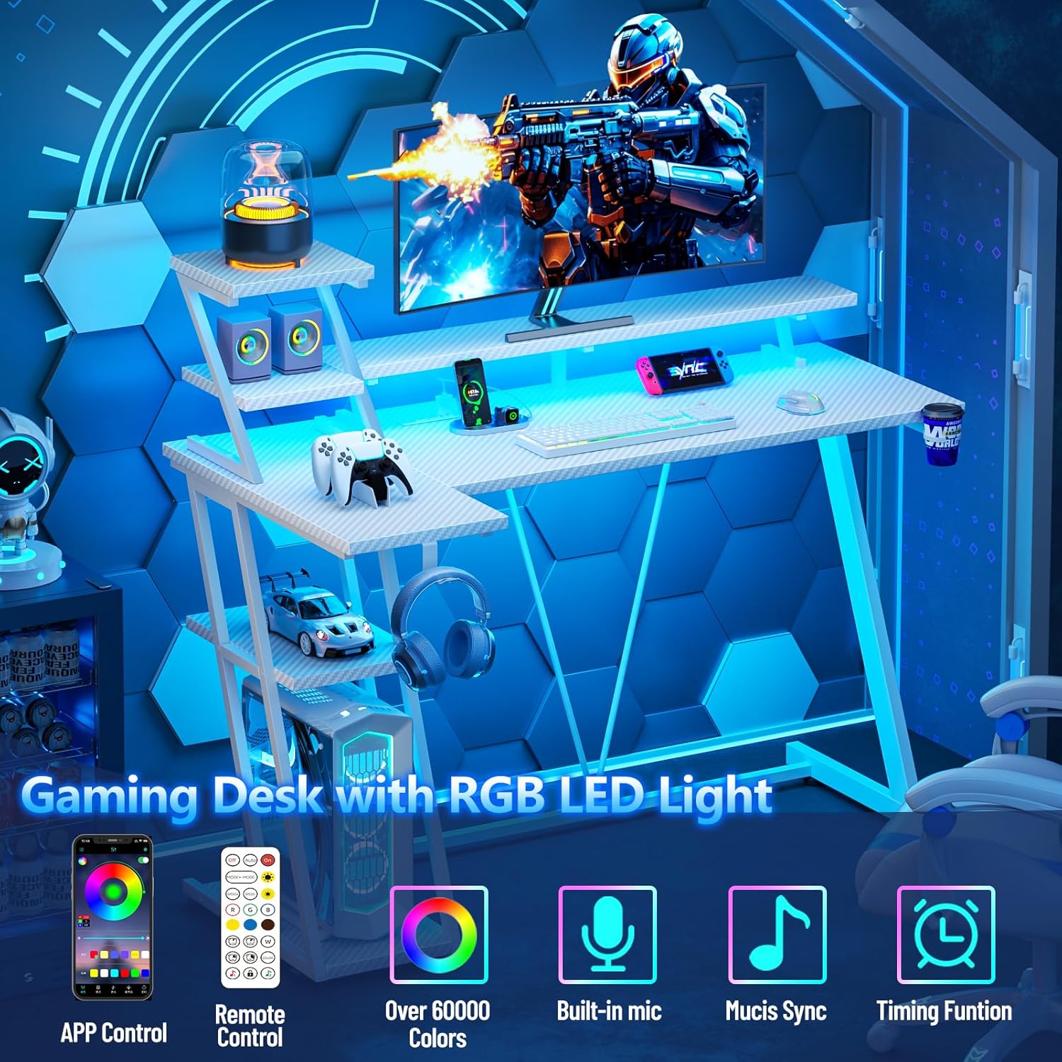 Carbon Fibre Texture:Made from MDF with a carbon fibre textured surface, this L shaped gaming table looks great when illuminated by the light strip and will enhance your room and gaming experience. It has a smooth, scratch-resistant surface that not only feels great in your hand, but is also easy to clean