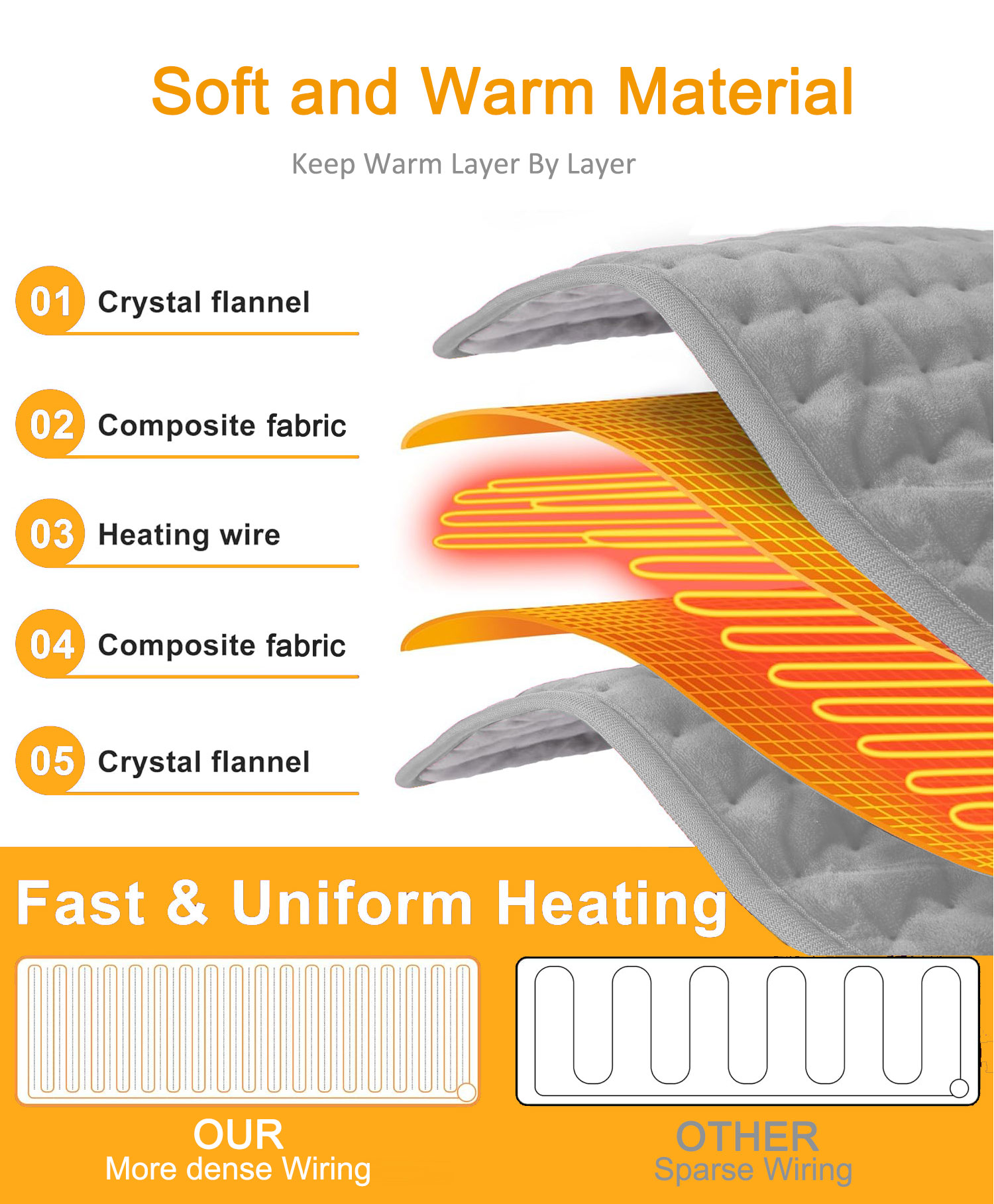 Crafted from ultra-soft crystal fleece and eco-friendly flame-retardant materials, this heating pad ensures both comfort and safety. It features intelligent temperature control and overheat protection, meeting global certifications like FCC, CE, UL, UKCA, and ROHS.